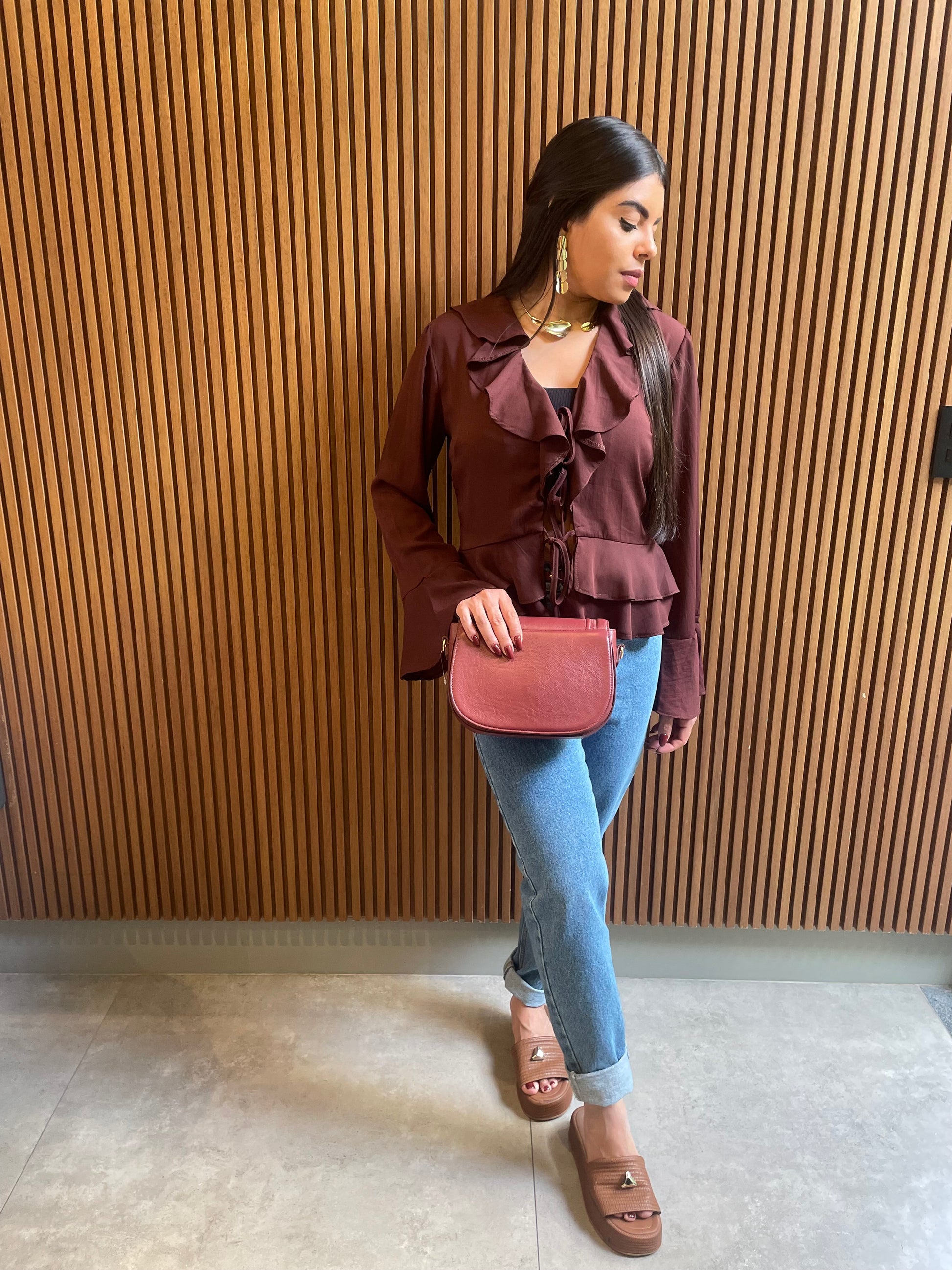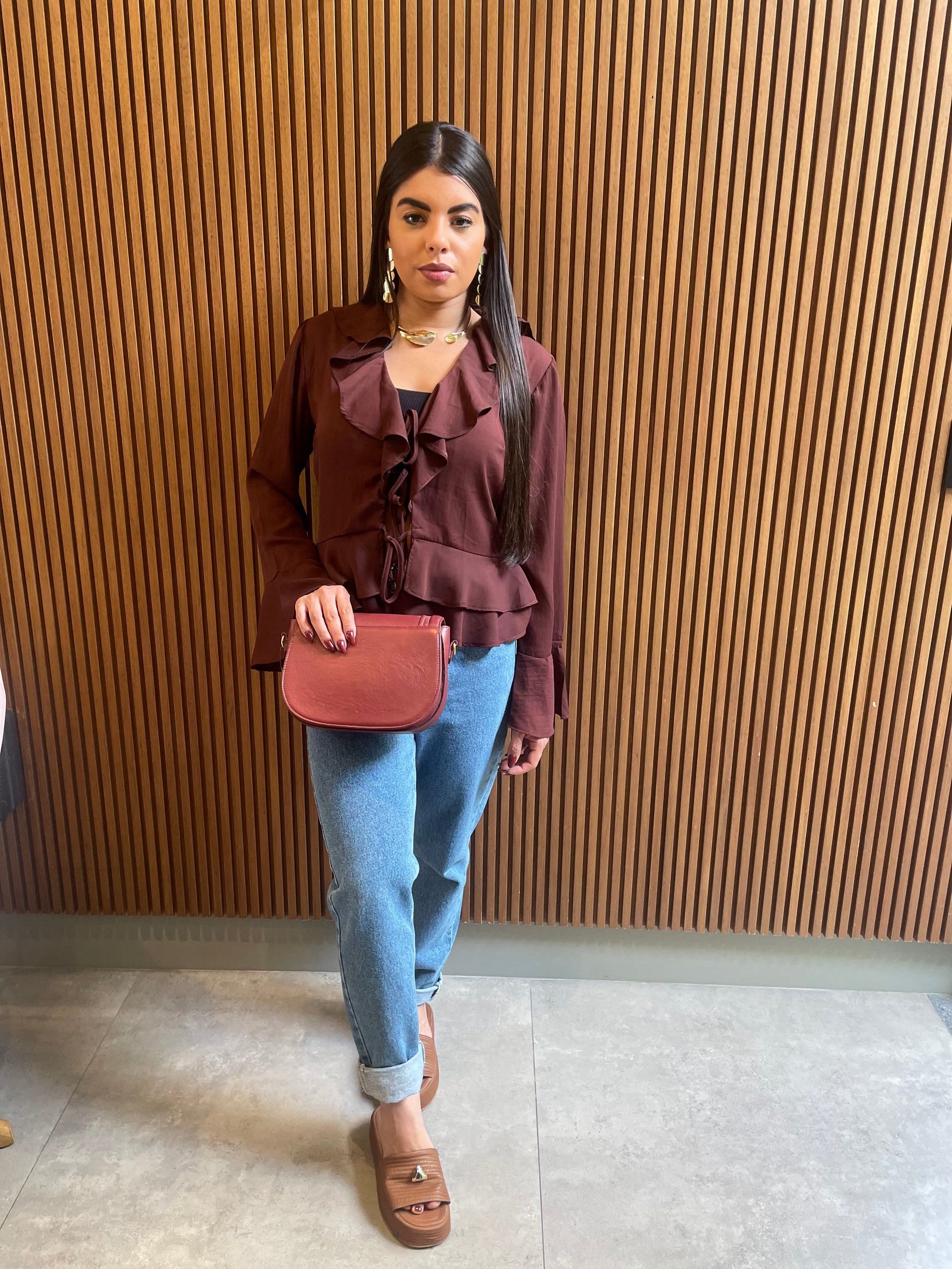 A blusa tem um design sofisticado e elegante, com detalhes que a tornam uma peça marcante. Ela apresenta um decote com babados volumosos que descem pela frente, trazendo um toque romântico e refinado. A blusa possui uma amarração na parte frontal, permitindo um ajuste delicado ao corpo.