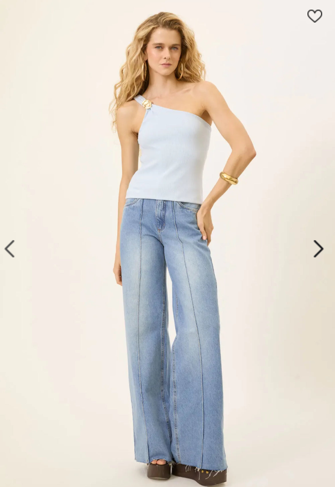 Blusa canelada rosa de alça única, com detalhe de aplicação dourada no ombro, estilo moderno e elegante.