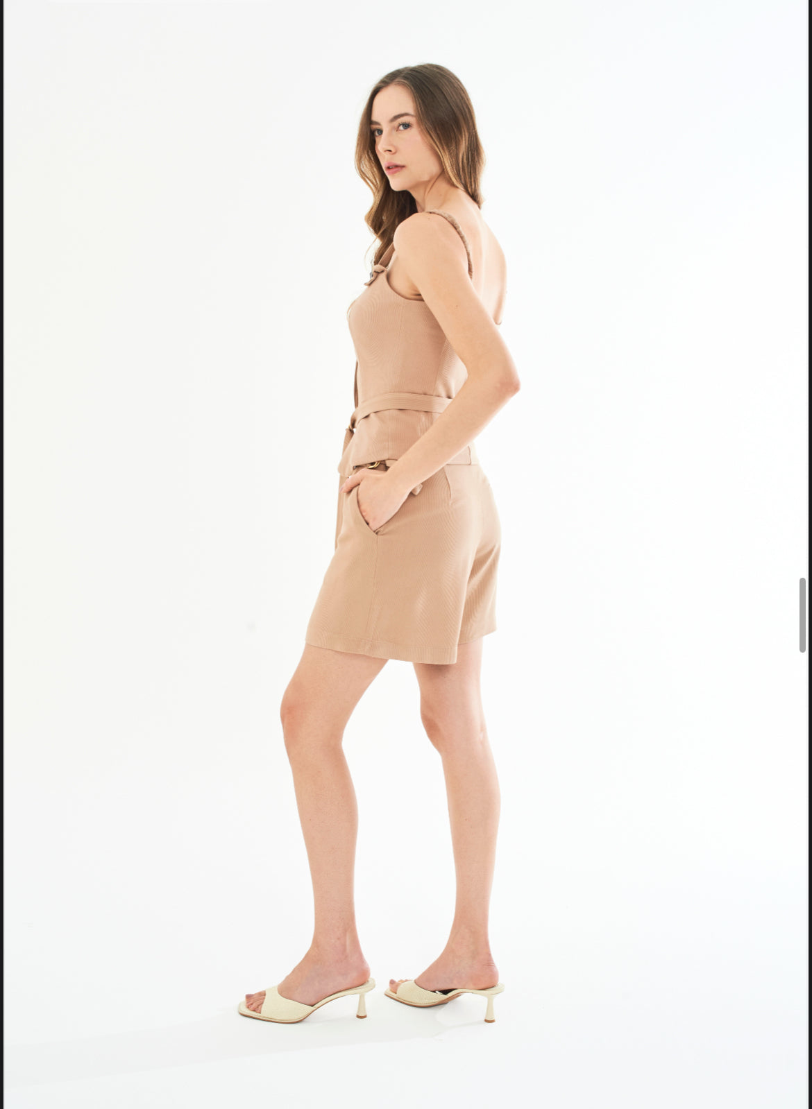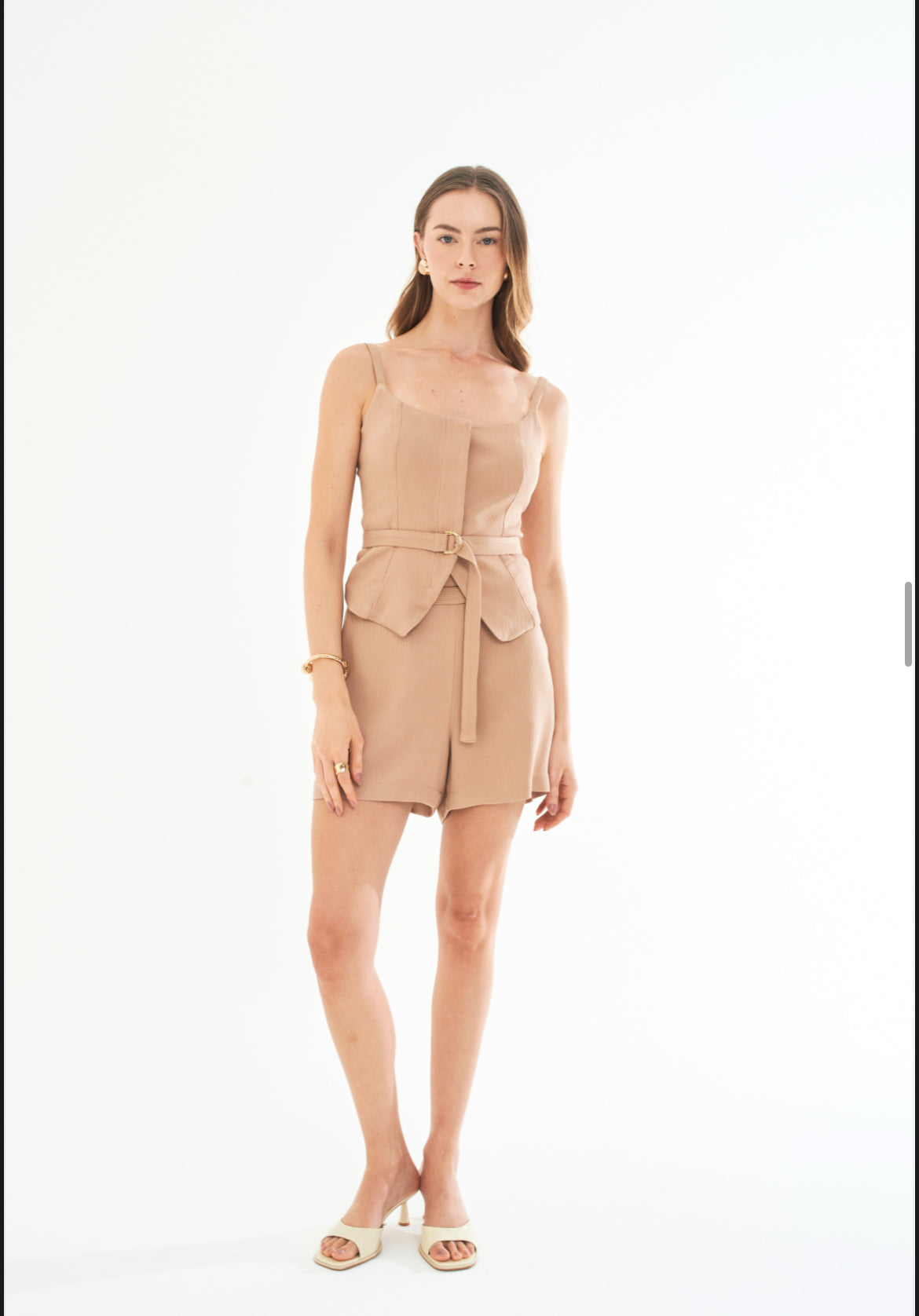 Conjunto feminino em tecido leve100% poliéster , composto por blusa de alcinha largas com recortes estruturados e cinto ajustável na cintura, combinado com short de caimento solto e barra simples, criando um look elegante e confortável.