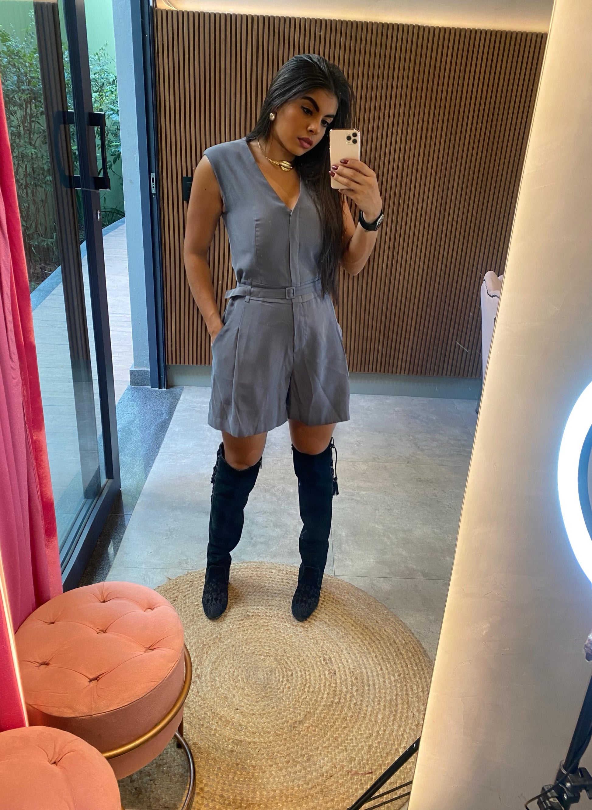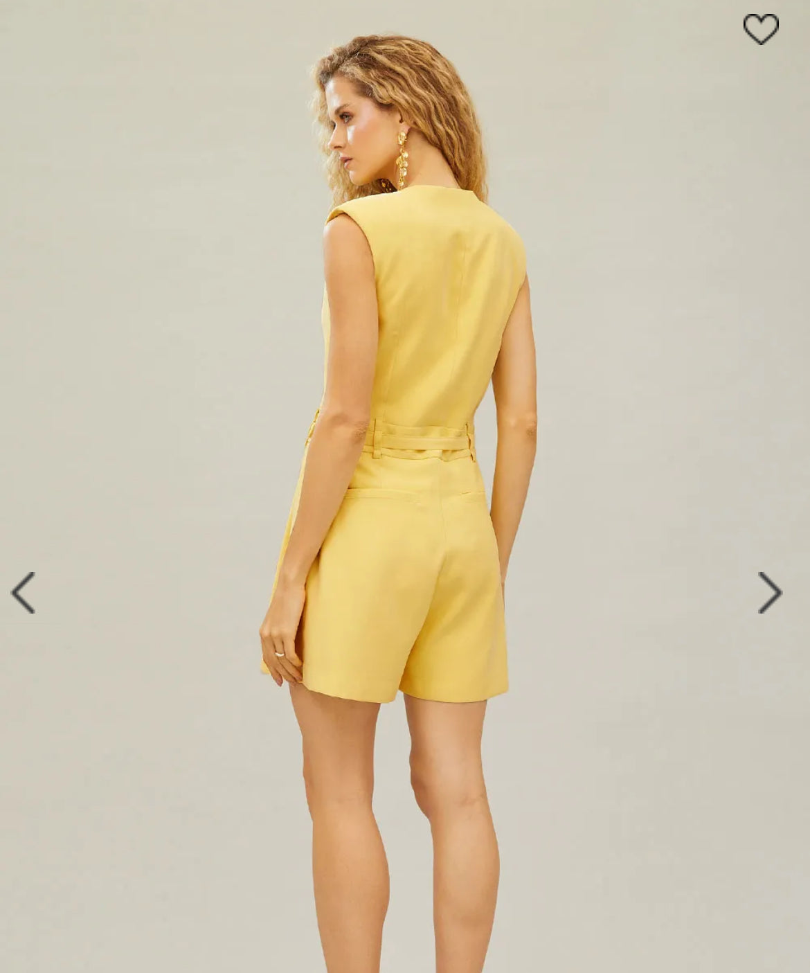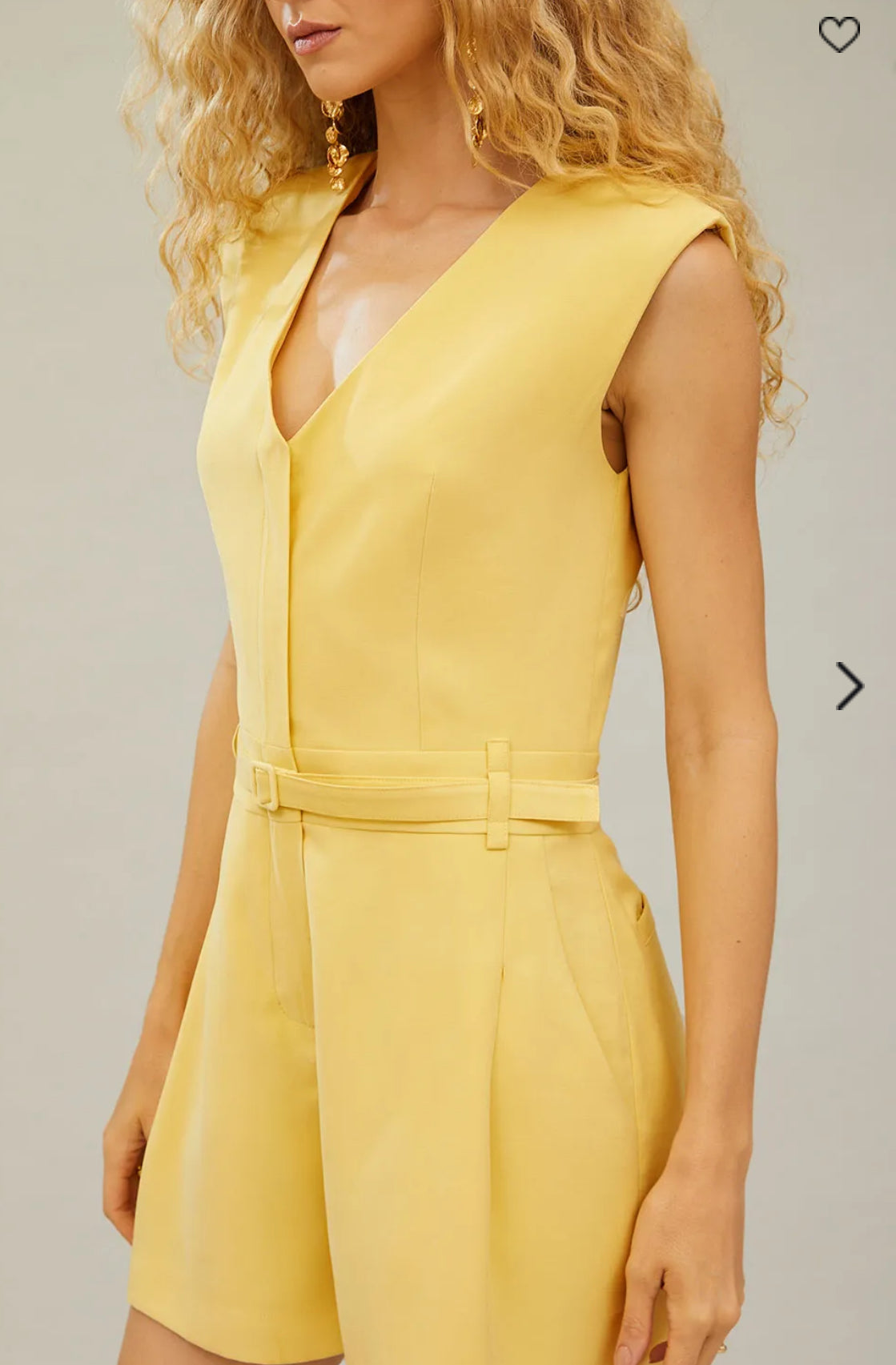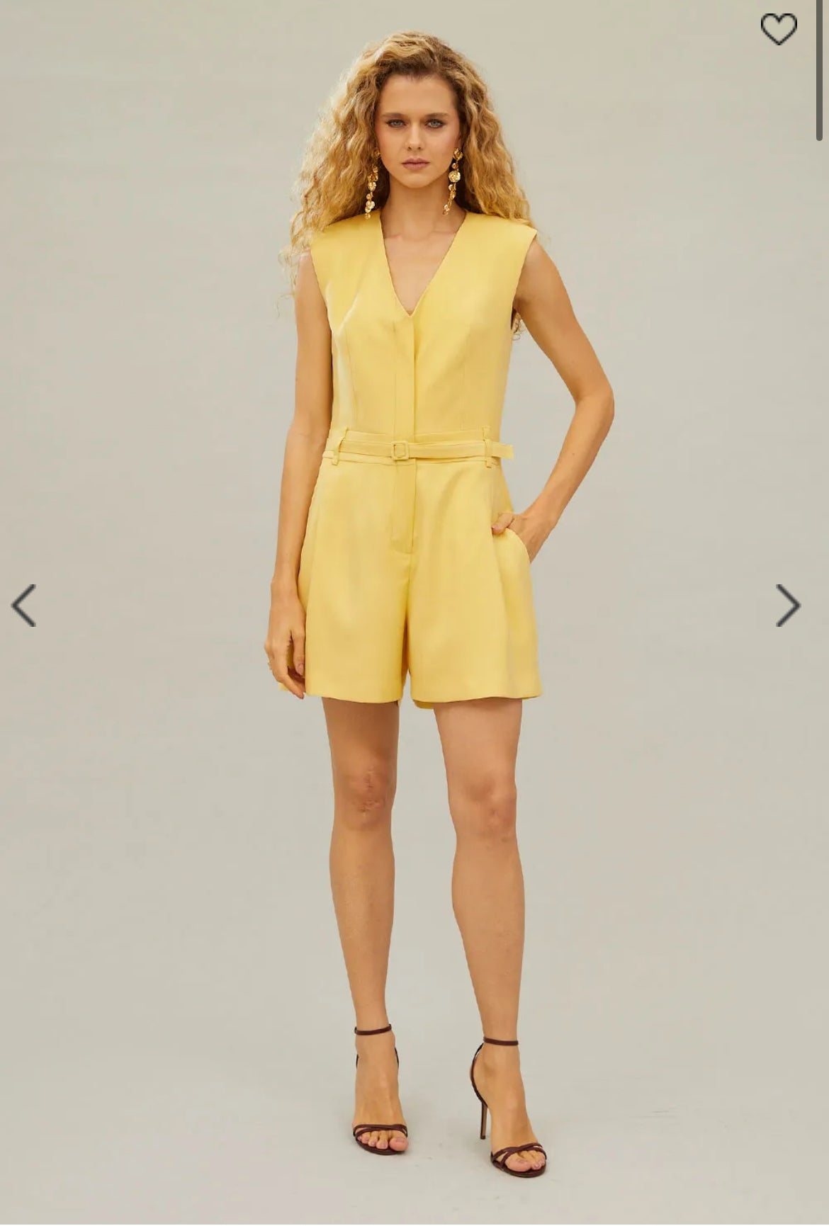 Macaquinho Regata Com O Decote Em V E Com Ombreira E Forro No Shorts. Possui Vista Com Zíper Invisível, Bolsos Faca E Pregas Na Frente. No Traseiro Possui Bolsos Embutidos E Também, Tem Um Cinto Do Próprio Tecido.