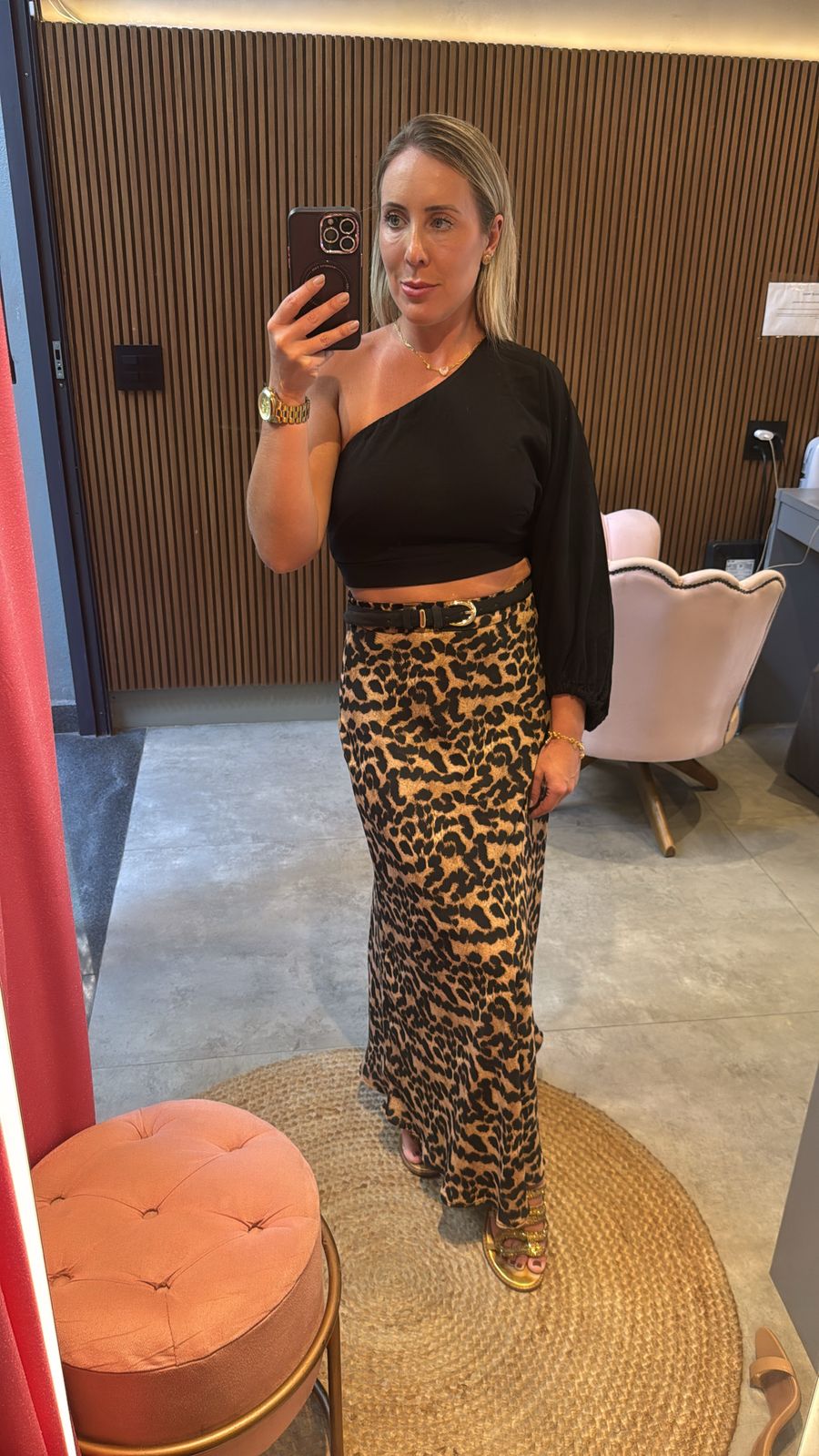 A saia é uma peça longa e justa, com estampa animal print em padrão de oncinha, misturando tons de bege e preto. Ela tem uma modelagem reta que acompanha o corpo, valorizando a silhueta de forma elegante e feminina. A cintura é alta e está marcada com um cinto preto com fivela dourada, que adiciona um toque de sofisticação ao visual. O tecido parece leve e fluido, o que contribui para o caimento natural e confortável da peça. Essa saia é versátil e poderosa, ideal para produções que combinam atitude e estilo.