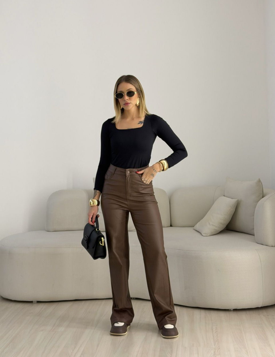 A Calça Couro transita facilmente entre produções elegantes e urbanas, combinando perfeitamente com camisas, blusas ajustadas, tricots ou blazers para um look contemporâneo e marcante.