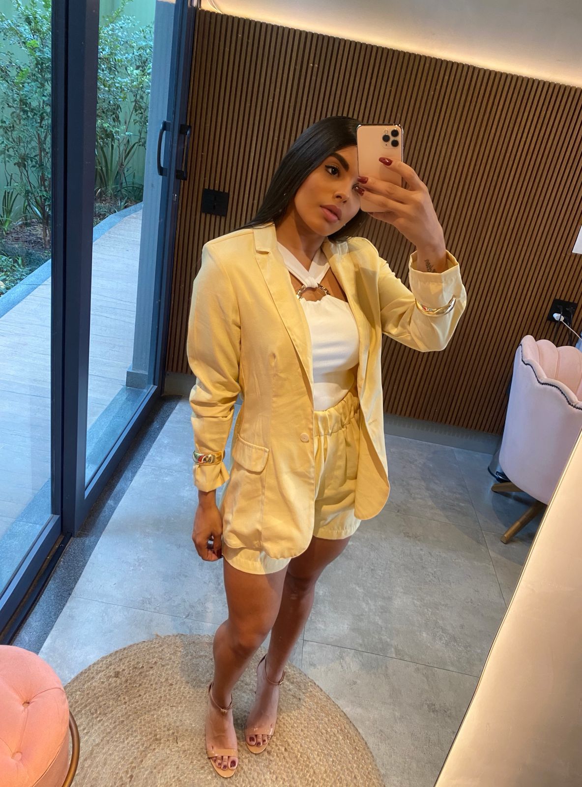 Conjunto moderno e sofisticado composto por blazer estruturado e short de alfaiataria, criando um look elegante e ao mesmo tempo despojado, ideal para ocasiões casuais com estilo.